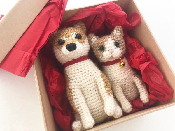 もんぱぴ猫ちゃんとワンちゃんのあみぐるみをプレゼント。 猫ちゃんの表情と、ワンちゃんの表情、体形の違い、雰囲気などが出るように編んでみました。 ペットと暮らすかけがえのない時間そのものが、あみぐるみの中に編み込まれていたら嬉しいです。