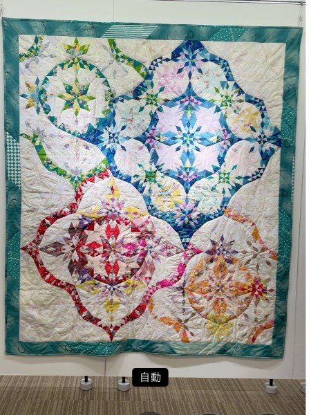 クラフトショップ青空タイトルは「生の輝き」です。命の素晴らしさを表現しました。カレイドスコープ(万華鏡)のパターンを発展させて、輝きと可能性の広がりを、色とりどりのピースで作りました。