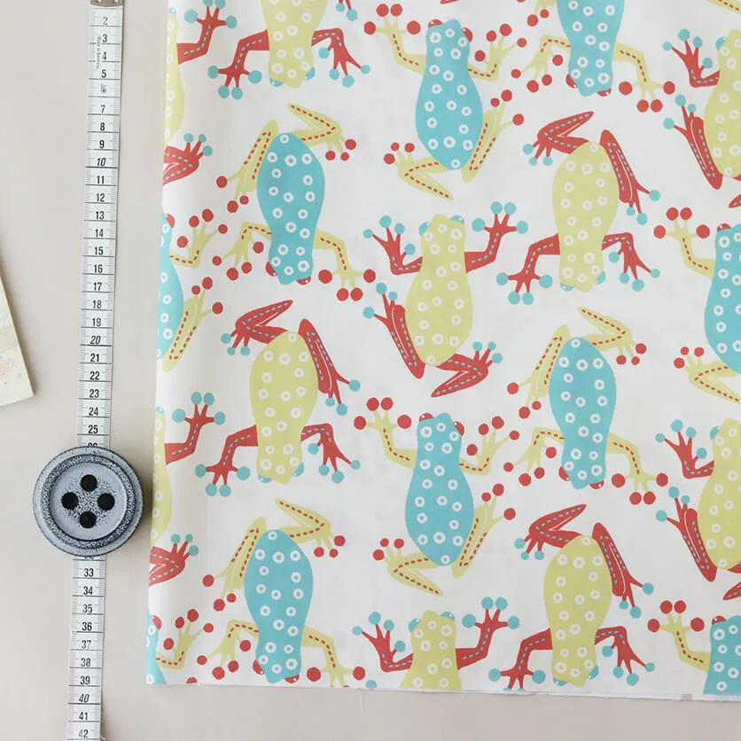 カラフルでキュートなカエルの気まぐれなパレードのテキスタイルデザインです。 鮮やかな色合いとチャーミングな表情で、どこまでも仲良く行進します。