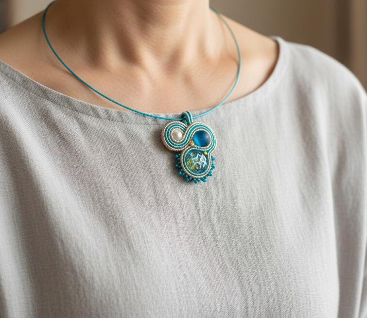 ヨーロッパ伝統技法ソウタシエを用いて、コードとビーズで流線型の装飾を施したネックレスを制作します。