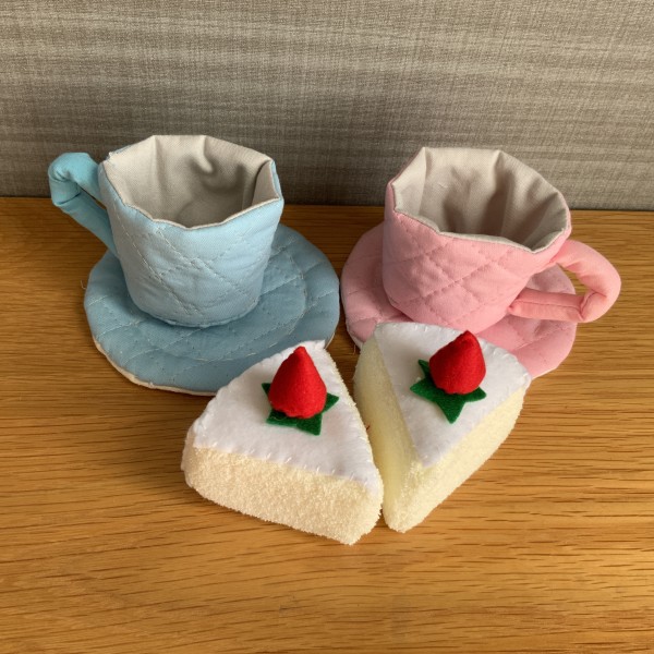 母子生活支援施設で、縫い物が苦手なお母さんたちにお子さんもおもちゃを作ってもらうための講座の作品です。 中にスポンジを入れて、周りはタオル(パイル)を巻いて、上にフェルトを貼ってます。 バターはフェルトを重ねてボンド、クリームは極太ロープを固結び。 お皿は中に厚紙を入れてますが、ここだけ、上を立ち上げるためになみ縫いをして絞ってます。お皿はコットンで挟んでいて、裏表別の布を使用しているので、リバーシブルです。