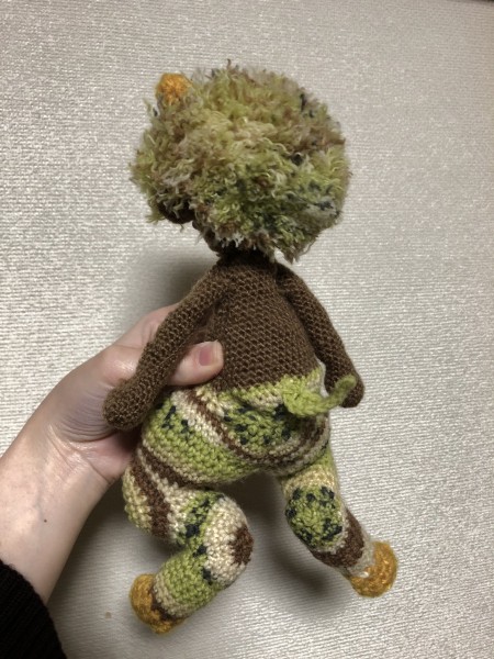 | 連投しまくり失礼します…サテュロスのあみぐるみ3にん目。 腰から爪先までとじ針無しで曲げてみました。かなりいい感じで曲がった!嬉しい!! もう少し尻を丸くできないかなーとか尻尾に重量感出せないかなーとかまだまだ進化の余地はあります。今年もがんばるぞ! 体毛部分はユザワヤのフリーソック(フルーツ)。バナナ色。年末のセールでお安く手に入れたやつでめーっちゃかわいい!ただソックヤーンゆえ糸が細くて大変でした… |