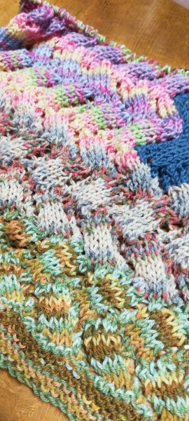 最初の方は一種類で編んでましたが、飽きてきて、途中から色変えや2色編みしてツギハギのようになってきました。