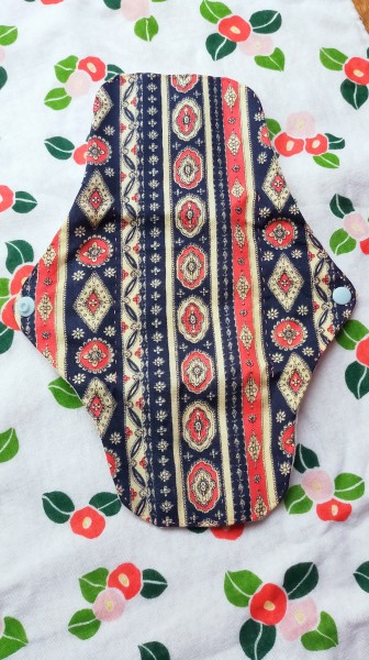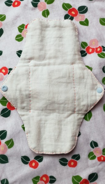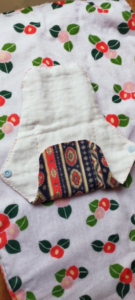 抗菌防臭ガーゼ4枚とスカートを作った時に余ったレトロな布を使い5重の仕立てになってます。