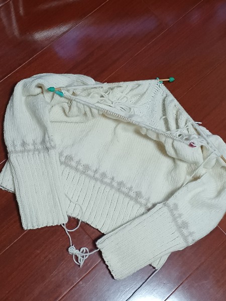 片袖まで出来ました。袖口のところにも、模様編み入れています。