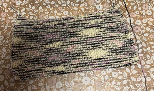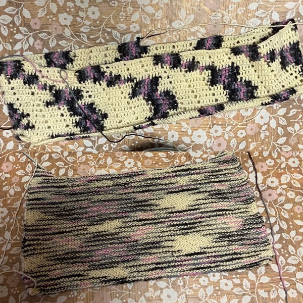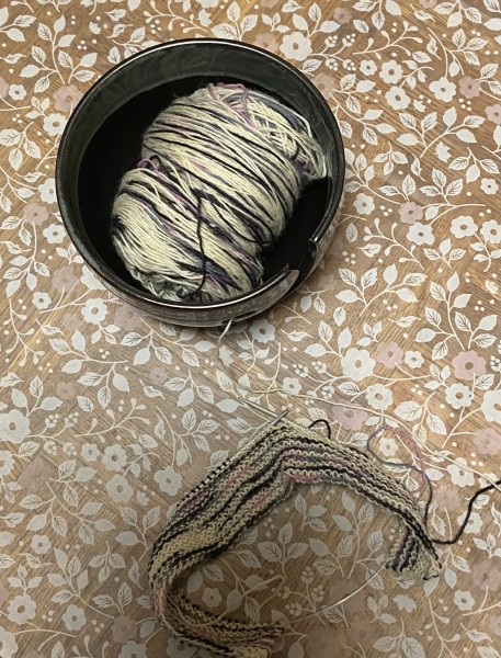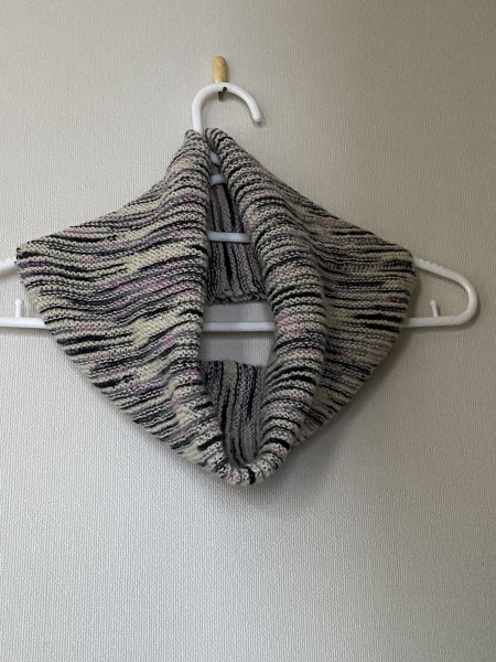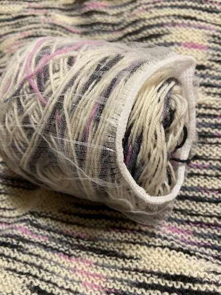 wingの毛糸の詰め合わさに入っていた中細毛糸で編みました。はじめはかぎ針で編んだけど模様の出方が好みでなかったのでガーター編みにしました。