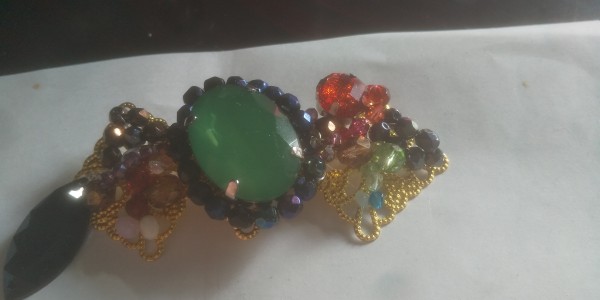 | 重ねた透かしパーツをテグスでビーズごと固定したブローチです。 そのせいか 裏はぐるぐる往復してるので見せられません 笑 ぐるぐるのお陰で ボンドで強く固定できましたし。 深緑のカボションを何とかしたくて作りました。自分用です。 配色は古いコーラのポスターのような 掠れた感じを出したかったです。  |