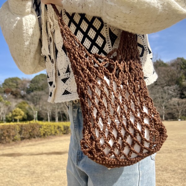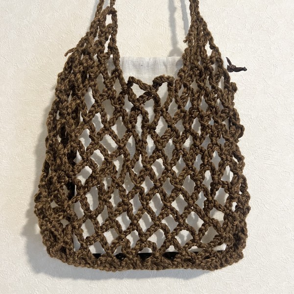 ざっくりとした編み地と濃い色味のネットバッグです。
