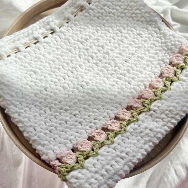 ベルベットのような手触りのTシャツヤーンをメインに、コットン糸で優しいカラーのチューリップの模様編みを入れました。