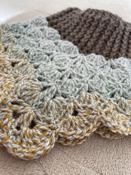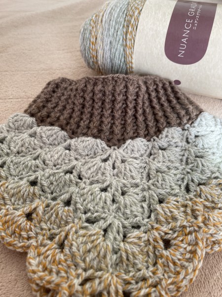 ネック部分と裾は茶色の毛糸で編んでみようと思っています!