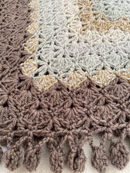 ニュアンスグラデーション1玉編み終わったところで、色を変えて裾を編み、ポンポンのフリンジをつけてみました!