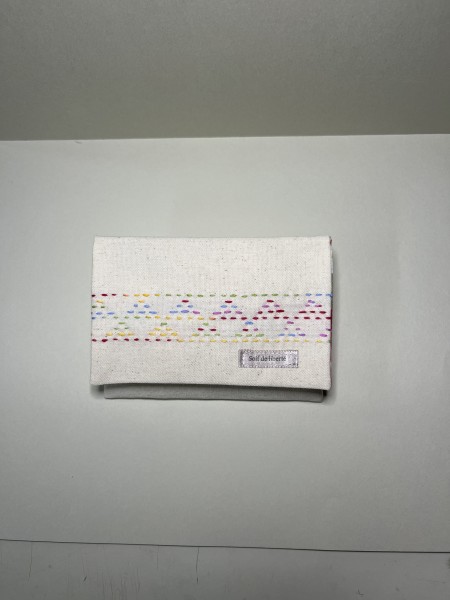 | 外側は、シンプルに無地布に刺し子を施した「ふた付きポケットティッシュケース」。 内側は、ちょっと派手めのmods fabricsのプリント布。 ポケットティッシュは、そのままバッグやポーチの中に入れると無惨な姿になる事が多いけど、ふた付きのケースならそれが防げるので便利です。 |