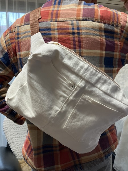 ホワイトデニムのリメイクバッグ。デニムを表にするつもりが、裏の生地が雰囲気良くて途中から路線変更、またまたリバーシブルになりました。