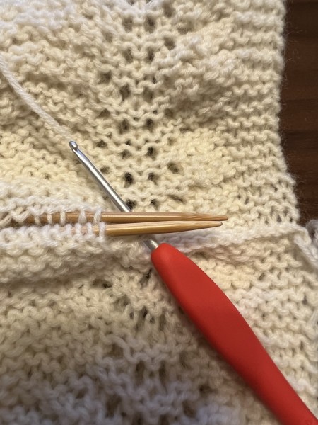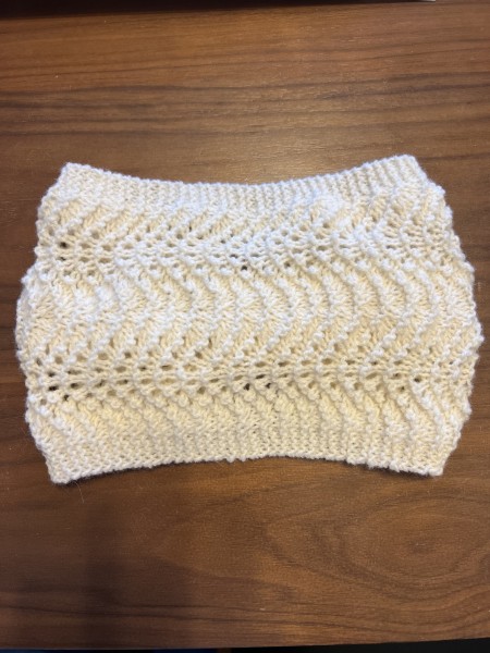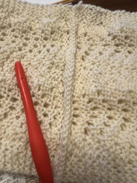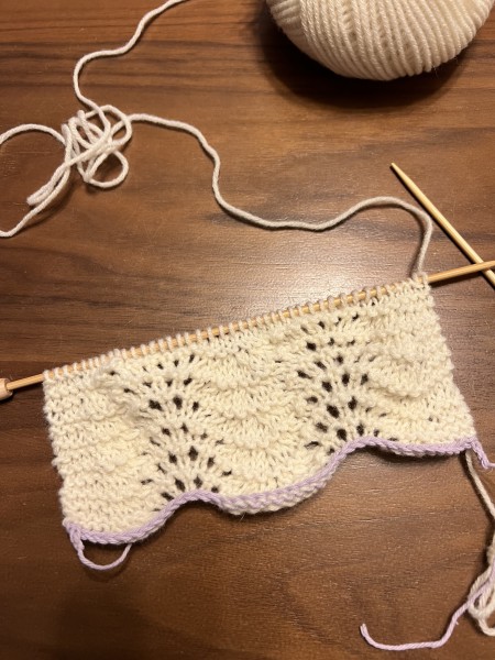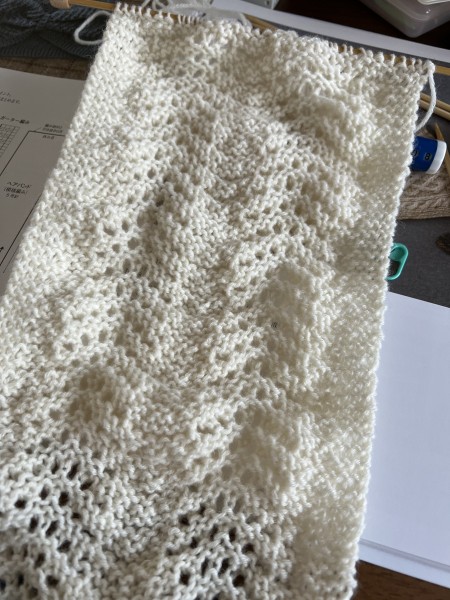 | 透かし模様のヘアバンドを編んでいます。きれいなウエーブ模様で、上手く完成できるように丁寧に仕上げたいです。 | |