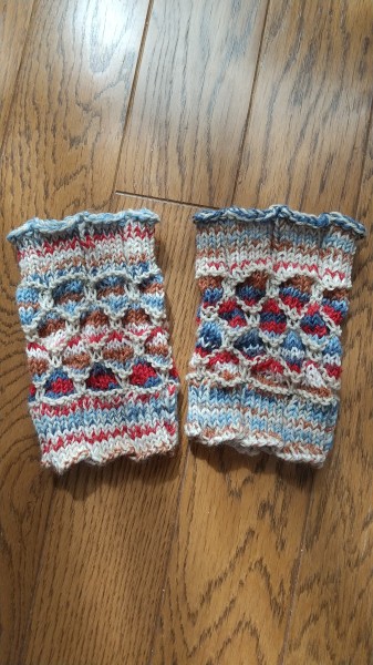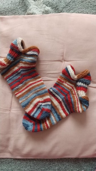 4plyのソックヤーン単色と段染めの2本どり、5号4本針で編む。