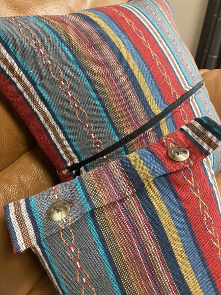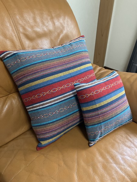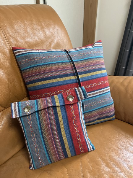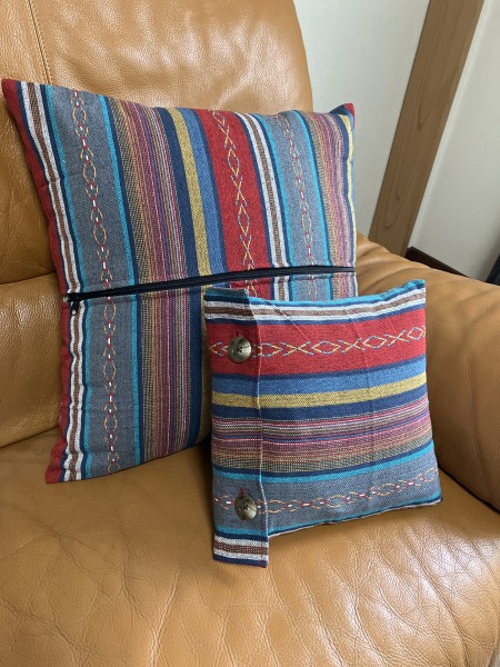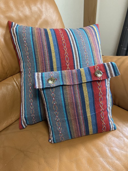 初夏へ向けて、親子クッション。インド綿生地でファスナータイプとボタンタイプで作ってみました。縦横の柄で雰囲気が変わるものですね。