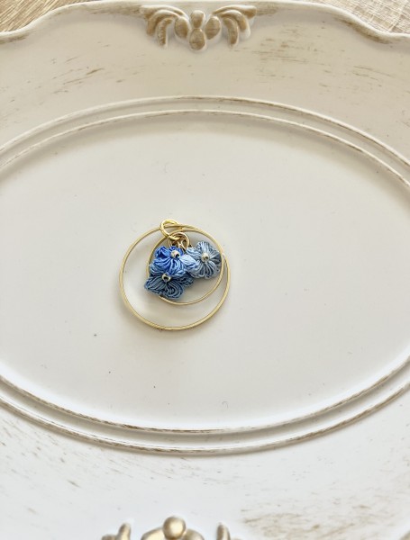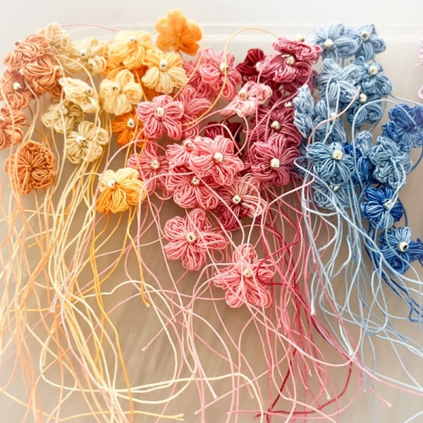 スペシャルダンテル(80番レース糸)で編んだ花モチーフに丸カンを付けて、余った端糸をハサミでカットしてます