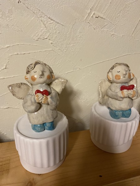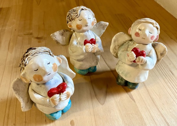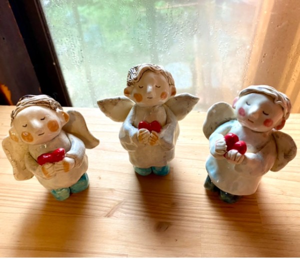 陶土で作り上げた陶人形です。そばにおいておくとなぜかほっと心が落ち着く不思議な存在感。白土で造形し素焼き、下絵付け、透明釉、焼成。