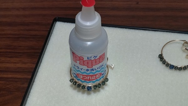 | ワイヤーをピケ(ほつれ止め)の容器に巻きつけて、 フープを作って、 同じ太さのワイヤーで丸カンを作ってイヤリングに通しています。 装飾は暗めのヴィンテージのクリスタルビーズを細いワイヤーで留めてます。 |