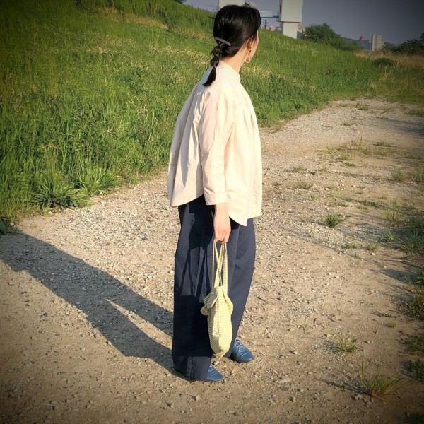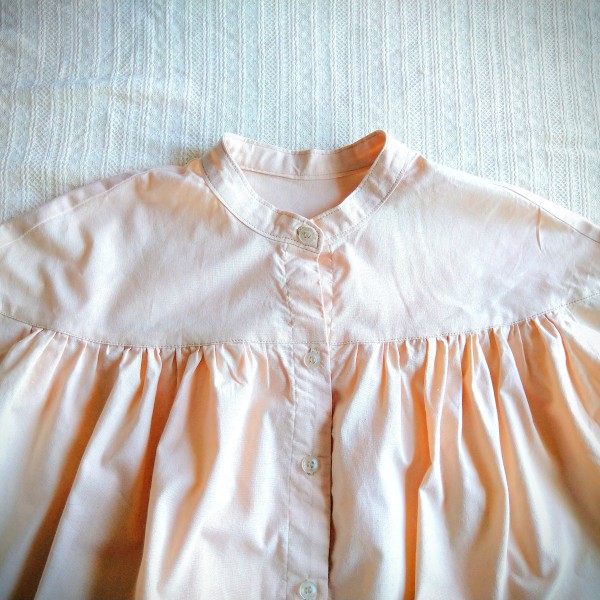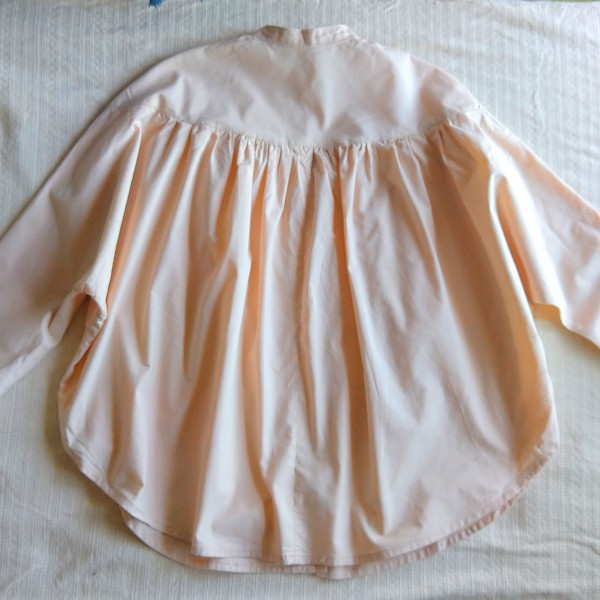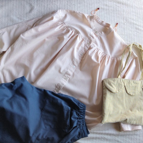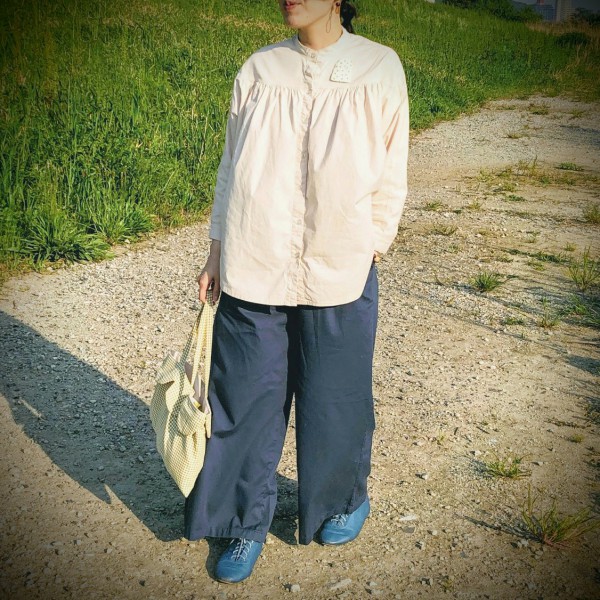 C&Sのパターン本から。ベージュのブラウスが着たくて作りました。衿はあえてつけずスタンドカラーに。丸みのあるヨークの形とふんわり広がるシルエットが可愛いです!
