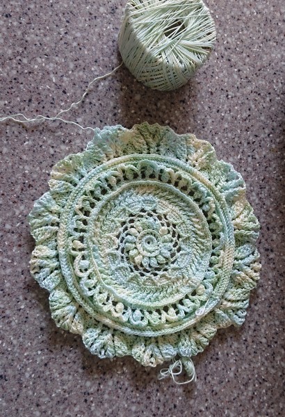 最終段開始。7月16日一枚目完成。すごく立体的で綺麗です。。ところが!こんどは糸が余った。25g玉×4玉余り‥‥つまり、材料半分残ってる。レシピの『材料90g/2玉』ってひょっとしたら90g×2ではなく、90g=45g×2玉準備だったんだ!と今頃気付きました。どうしよう