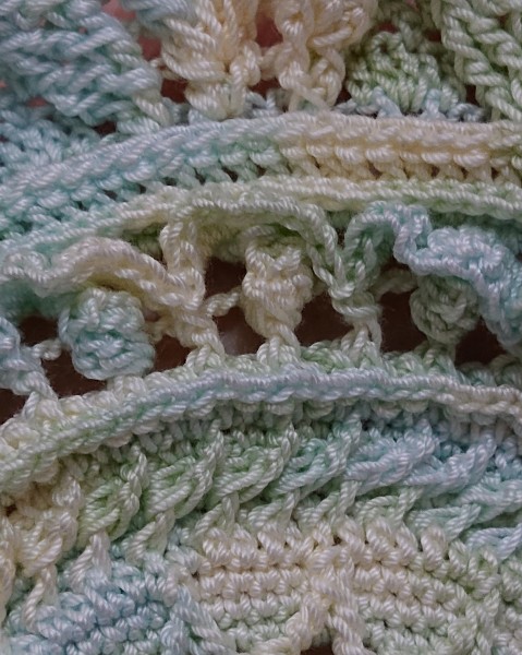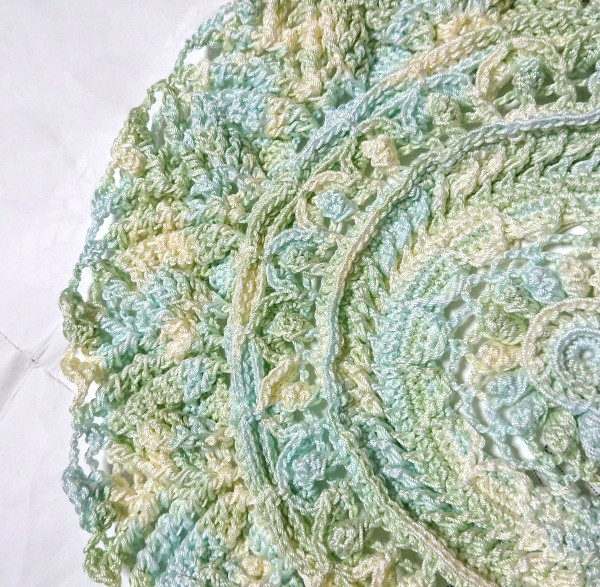 かなり進み、編み目の構成もわかってきたつもり‥‥だったのですが、円の外側の花びら状の部分を裏引き上げにしてしていた事に気付き、(拡大写真)表引き揚げにやり直し。またもや後退しました。