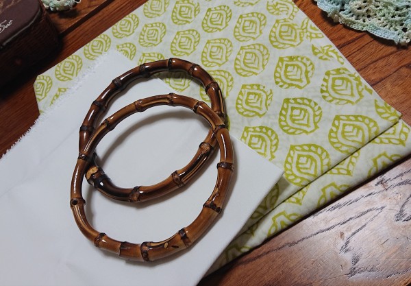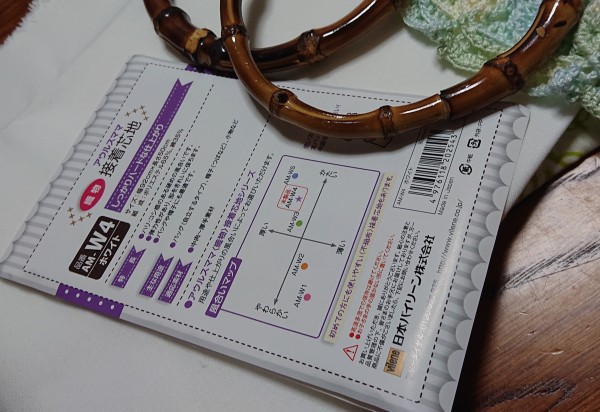ユザワヤで持ち手、硬めの接着芯(日本バイリーン AM-W4ホワイト)を購入。裏布は、雑貨屋(Todays Special)で見かけたインド製の生地を用意。