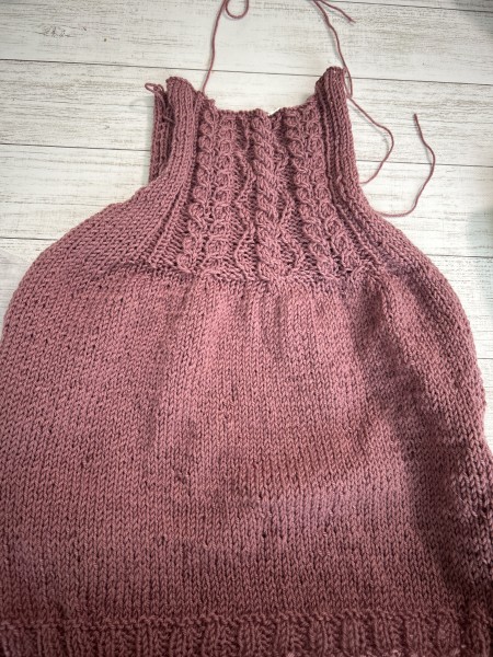 後ろ身ごろはえり開きの線を無視して、上の線まで編んで伏せどめします