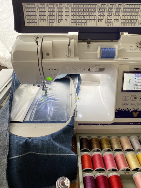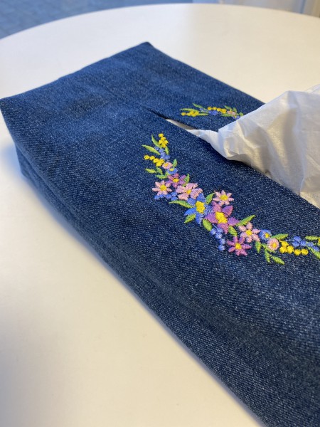 刺繍ミシンに付属していたお花模様の練習を兼ねて、家にあった古いデニムをティッシュケースにリメイク。