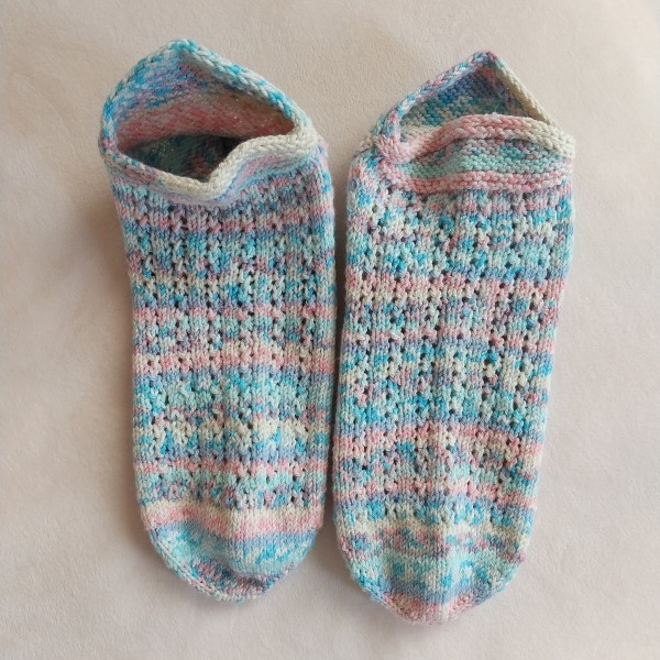 | REGIAのAround the World一番人気の糸で編むうつぼソックス 甲の部分に透かし模様を、踵フラップ部分に斜めの模様を入れてみた。 |