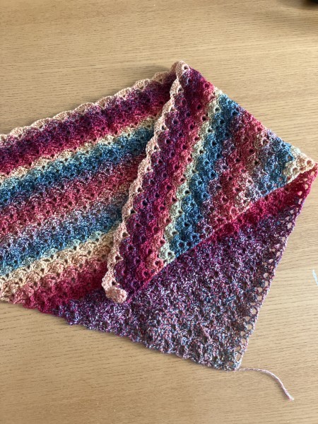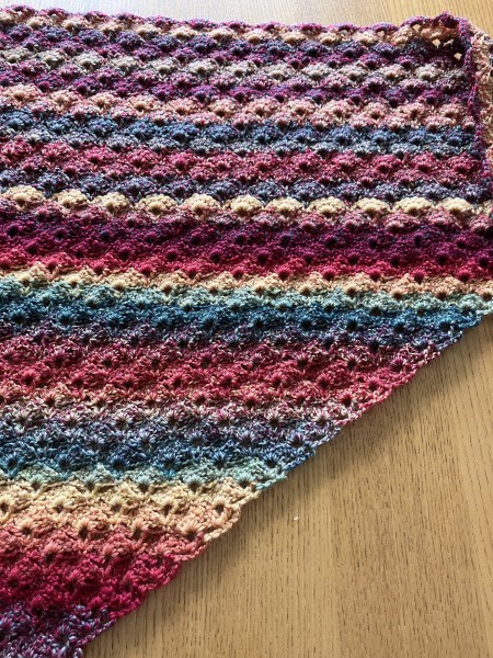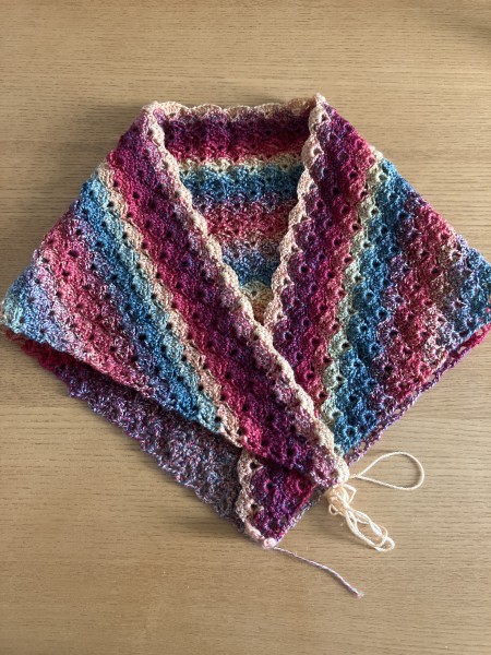 | ユウヤケで三角ショールを編み始めました 2玉編みきり、大きめショールが出来上がりました とてもかわいい編み地で、もう一枚作りたくなります |