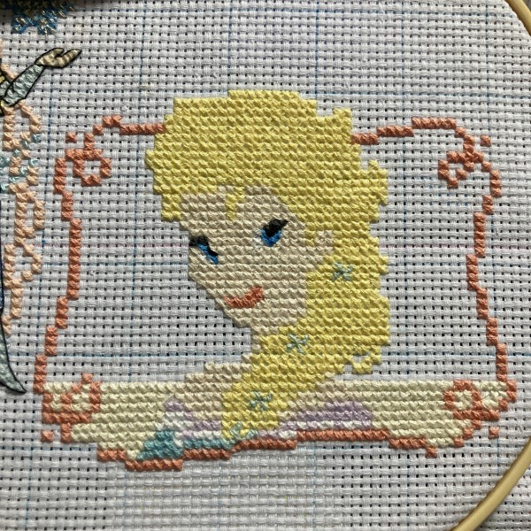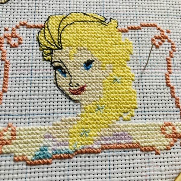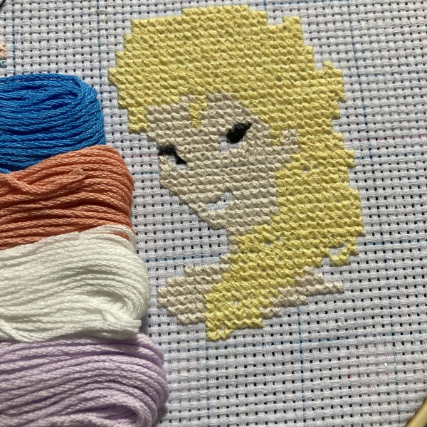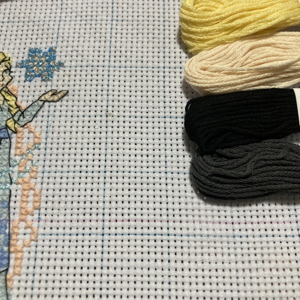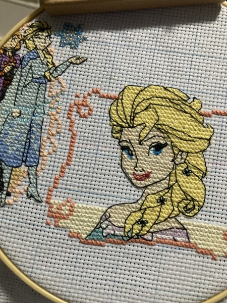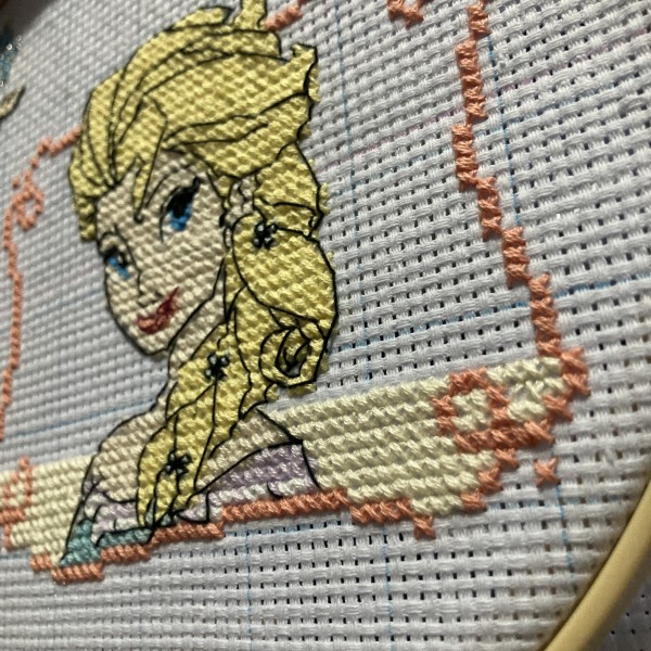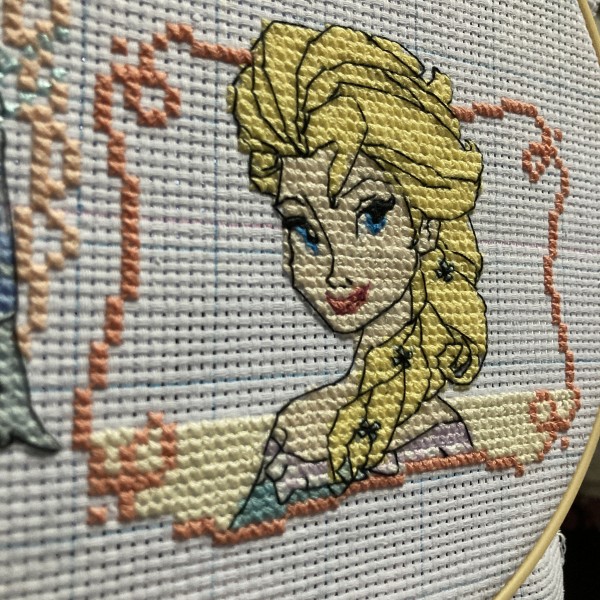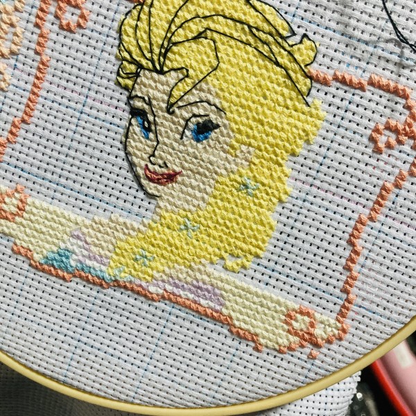 | アシェットさん週刊「 はじめてのディズニークロスステッチ」より、94〜96号のエルサに着手しました! バストアップなので顔のバッグステッチは特に丁寧に☺️✨ |