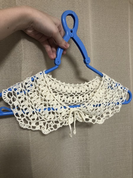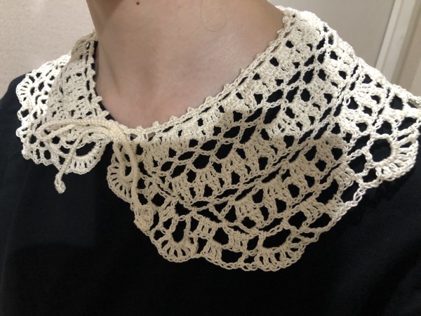 | クロバーのサイトにあった「かぎ針で編む ネット編みのつけ襟」を編みました。 https://clover.co.jp/recipe/post_51 一段減らしてみたりヒモを短くしたりしています。 よく見るとだいぶやらかしてるのであまりよく見ないでほしい、でもかわいいから見てほしい、ジレンマ |