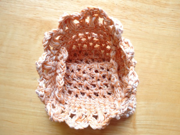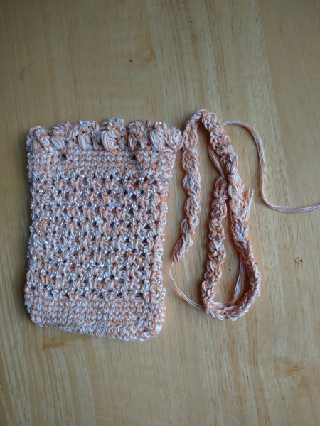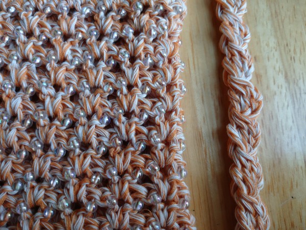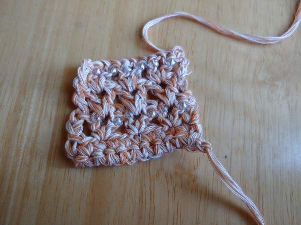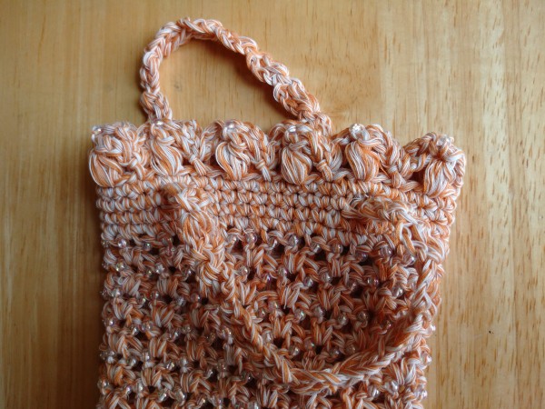 オレンジ系の糸でビーズ編みの小バックを編んでみました。