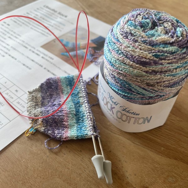 ウツボソックスKALでたくさんの方がいろいろなウツボソックスを編んでいるのを見て、挑戦してみたくなりました。久しぶりの靴下です。