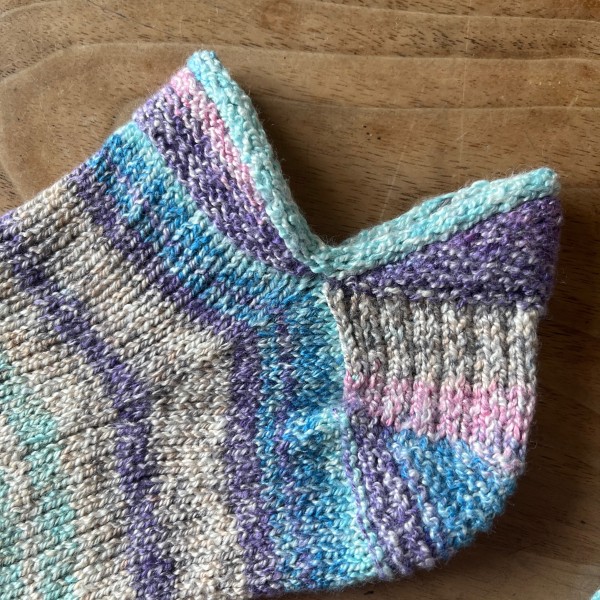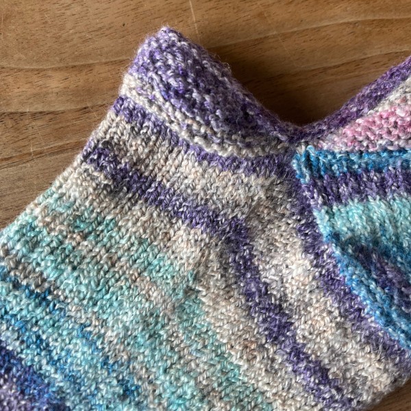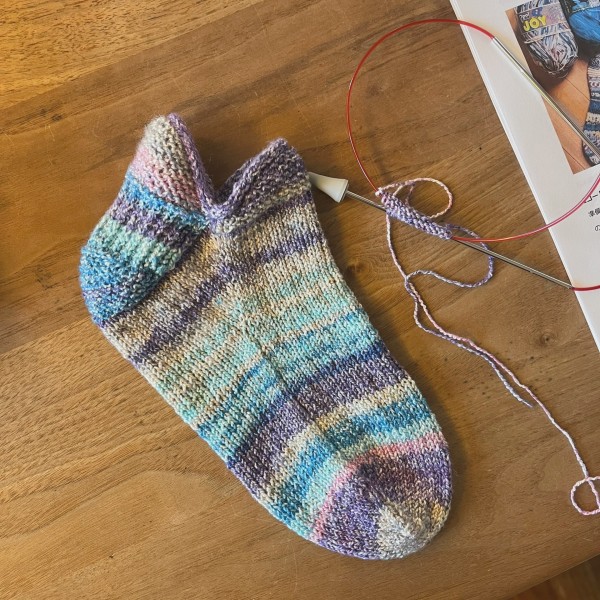 片方編めました。久しぶりの靴下編みで楽しすぎて!どんどん編んでしまいました。子供に試着してもらったら履き口のiコード止めが少しキツいと。針の号数をあげて緩めに編んだつもりだったけど、自然と力が入ってしまっていたかも。