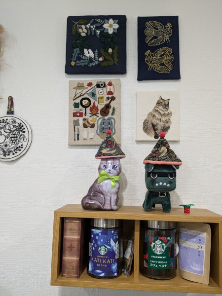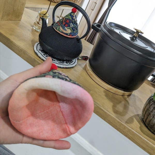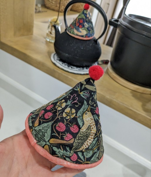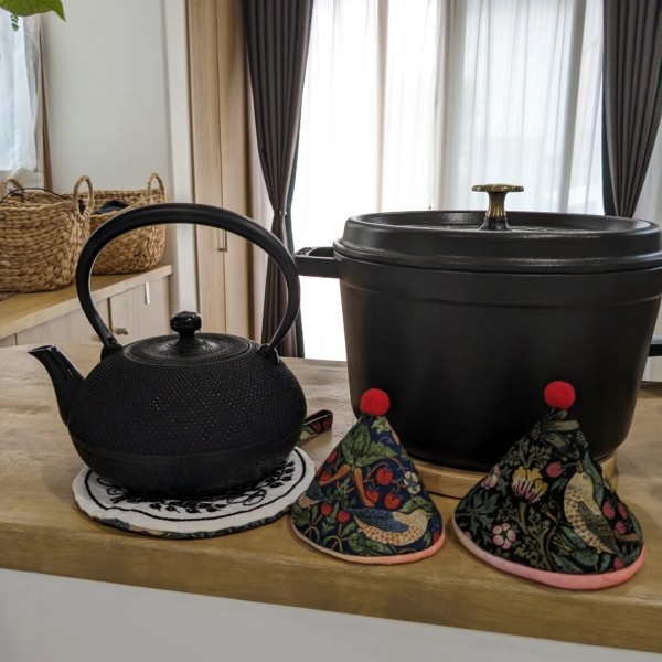 | 南部鉄器の鉄瓶を買ったので、三角鍋つかみを作りました ウイリアムモリスのいちご泥棒の色に合わせてトップに赤いポンポンを 裏地は夕焼け色のグラデーションが気に入った、かや織りふきん 分厚く重ねて縫い、鍋つかみの素材としてはとても使いやすく、いいチョイスでした! YouTube検索して制作しましたが、作り方としてはトップにループを付けてぶら下げる作り方が多いのですが、絶対にいちご泥棒色のポンポンを付けたかったので適当に裏から縫い付けました キッチン背面の可愛い子達にかぶせています♡ |