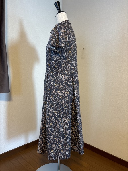 麻綿混布地で作ったワンピース。まだ暑い日が続いていますが、布地は秋模様の色と柄です。