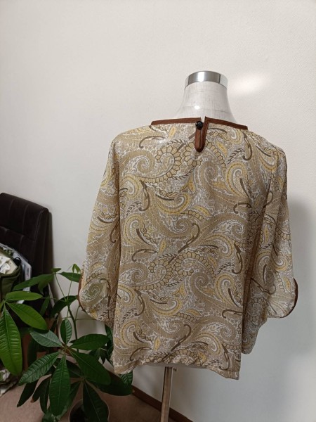 | 要藤商店さんでポリエステル1.6m購入 ミセスのスタイルブック2019盛夏号より 透け感のある生地で 最初はオーバーワンピのつもりで購入したら生地幅間違えてて 笑 オーバーブラウスなら足りるかな?と変更して作成。 中にタンクトップかキャミは必須かなー。 本では共布でバイアス取ってたけどちょっと無理なんで同系統の色のバイアステープで袖ぐり襟ぐりを処理。 |