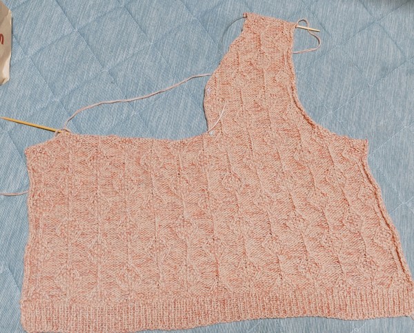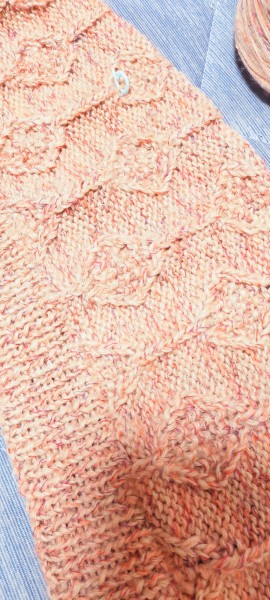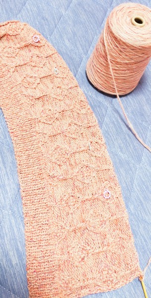 後ろ身頃が出来あがったので前身頃を編んでます。