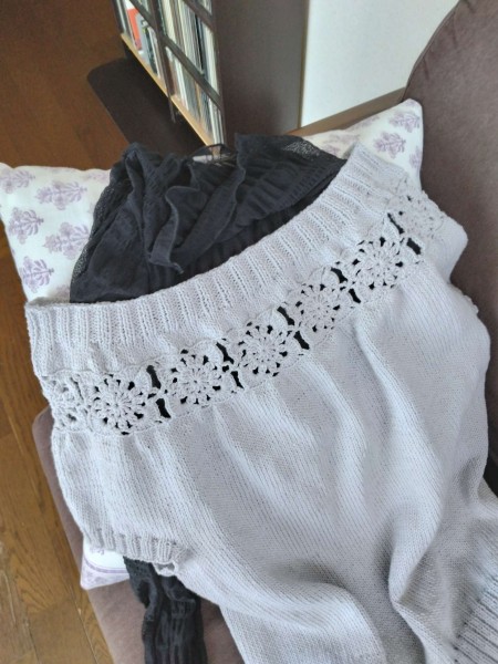 糸を切らないモチーフ編みを襟にしてメリヤス編みで編み下げました。