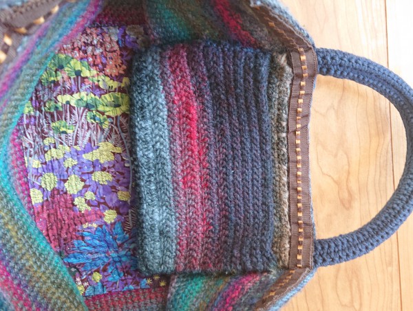 持ち手が伸びるのを防ぐため、筒状の中に芯となるものをいれ補強。本体の上部にもグルっとグランリボンとさらに上からリボンで縁取り。利便性を考え内側にポケットもプラス。