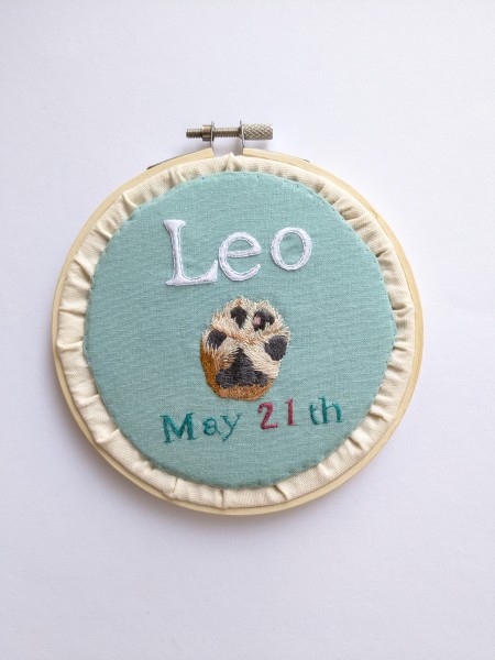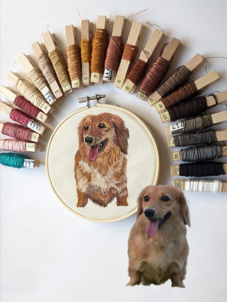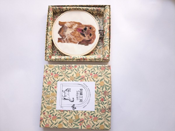 | オーダー刺繍枠飾り 全身刺繍 ミニチュアダックスフント 茶色の毛の流れと、長い舌や笑った表情が難しかったです。 選べる裏面刺繍はお名前、お誕生日、肉球のオーダーだったのですが、犬に疎い作者は肉球のイメージが難しく、(犬種によって違うのでは?何色?)と混乱した為、足裏写真を送って頂き、もふもふの足裏刺繍になりました。 大変ご満足頂き良かったです。 文字刺繍が苦手分野なのでそれが残念…きちんと学びたいです… |