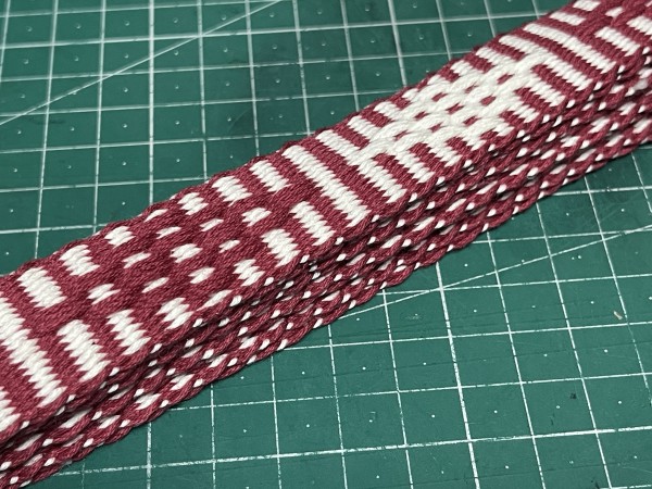 赤白のボーダー+赤と白のひし形模様が浮き出るように織り込んでいます。