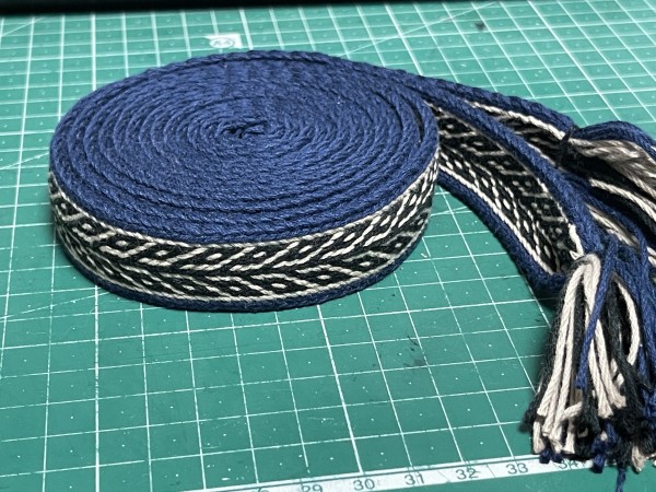 カード織で作った七分紐で、単一の向きで連続した模様の織りの習作です。