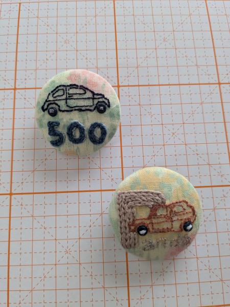 様々な車を刺繍し缶バッチにしました。