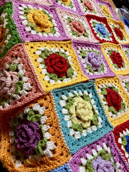 | 寒くなってきたのでお花モチーフ編みのブランケット。お花がいっぱいの明るい色で気分もウキウキ。縁編みはマゼンタピンクで。 やっとこ完成です。 |