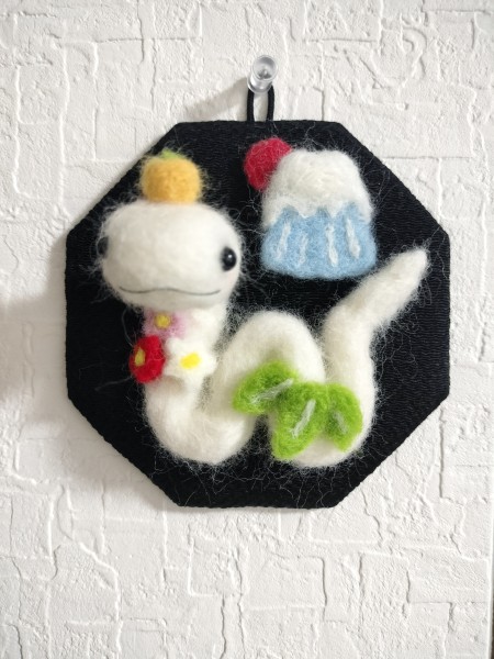 来年の干支飾り、白蛇ちゃんを羊毛フェルトで作りました。白いから鏡餅のように橙を頭に乗せて見ました。