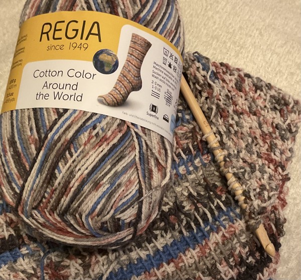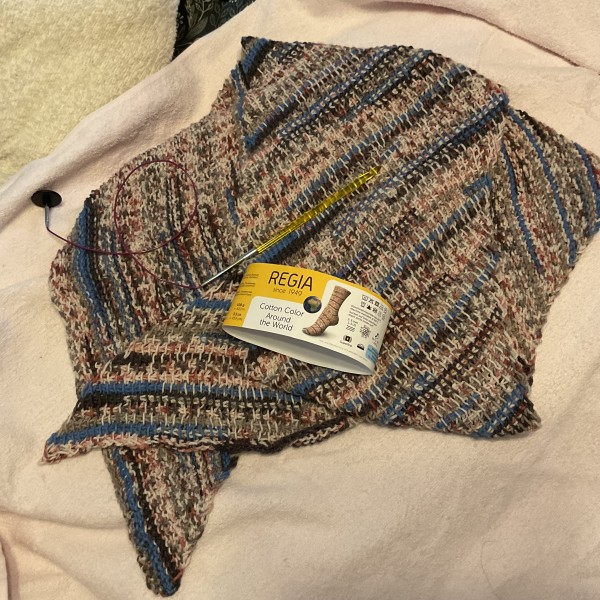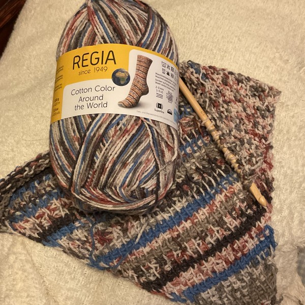 | Regiaコットンアラウンドザ・ワールド、パリを使って 斜めガーターマフラーの要領で アフガン編みにしました 途中までクロバー12号 その後ニットプロ10/0 6mm 60目で編むと柄の出方がイマイチだったので 40スタートの途中なんとなく増やして56目で終わりました ゆったり編みで1玉編み切り ビギナーがテキトーに編んだ割には よくできた、ことにします |