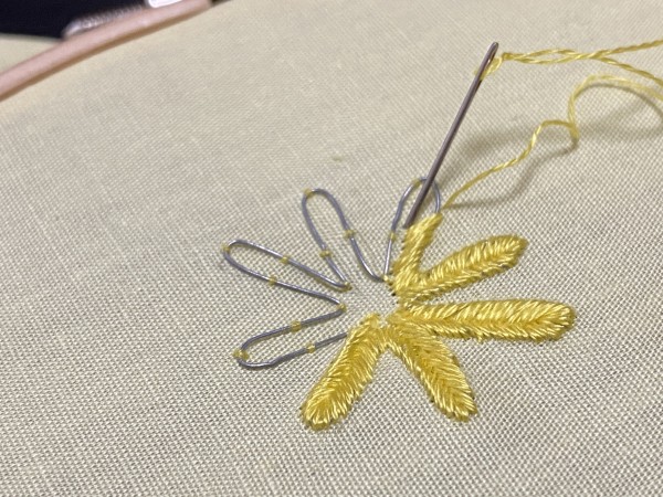 根っこつきのたんぽぽを立体刺繍で作っています。
